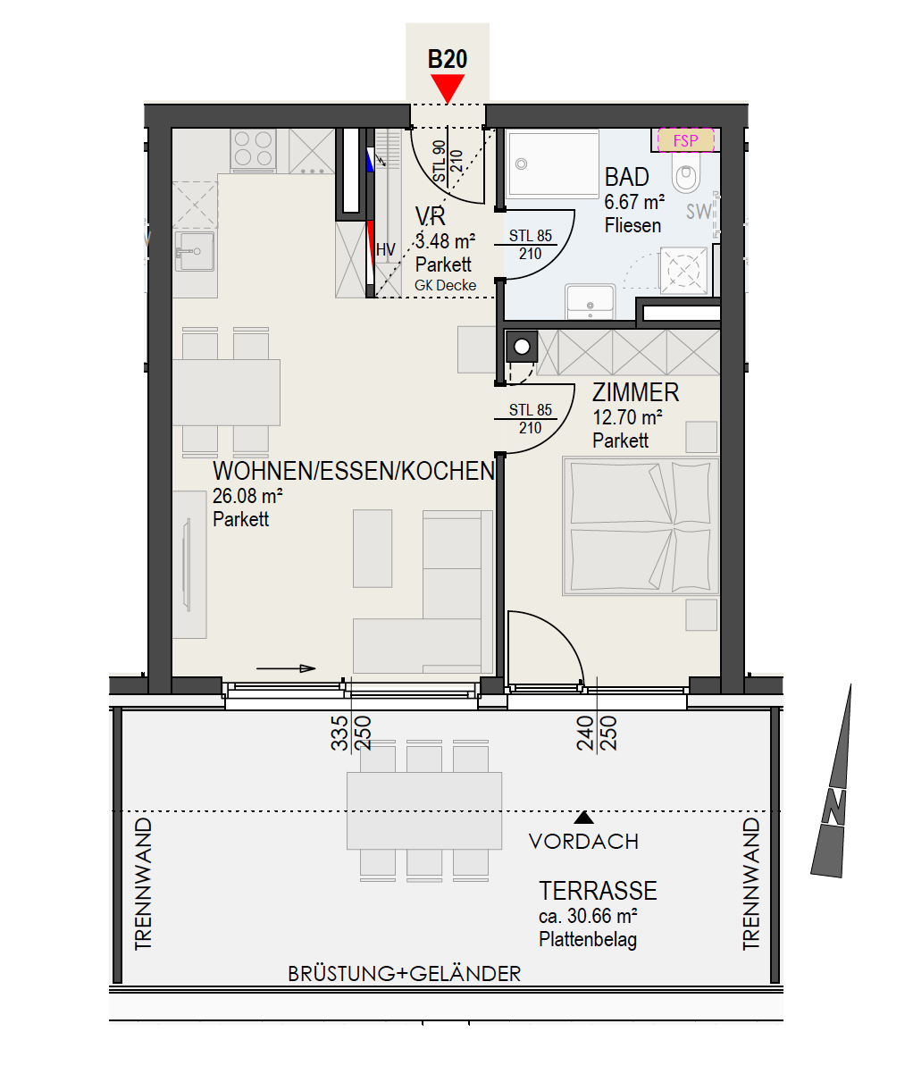 • Großzügige Dachterrasse (30 m²) mit Markise
